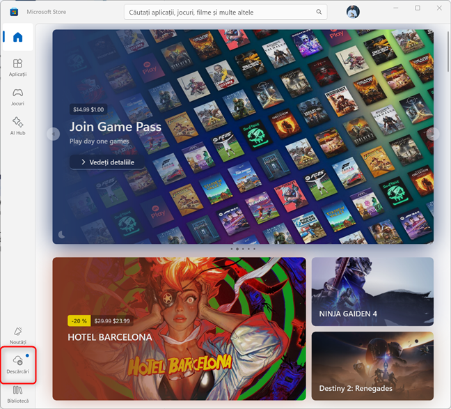 În aplicația Microsoft Store, apasă pe Descărcări în colțul din stânga jos.