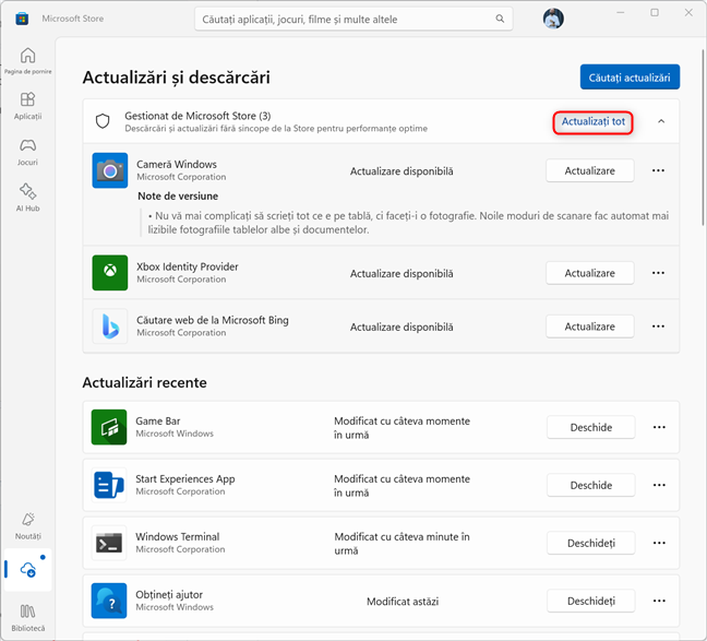 Pentru a instala toate actualizările de aplicații și jocuri disponibile în Microsoft Store, apasă pe Actualizați tot. Dacă, din orice motiv, o aplicație nu se actualizează automat, poți apăsa butonul Actualizare de lângă ea pentru a începe procesul.