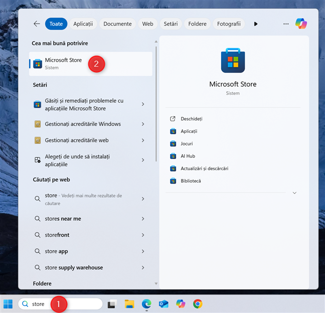 Asigură-te că ești conectat(ă) la internet, apoi deschide Microsoft Store. O modalitate de a face acest lucru este să scrii în caseta de căutare de pe bara de activități, cuvântul „store” și apoi să dai clic pe rezultatul Microsoft Store. De asemenea, sunt șanse mari să găsești scurtătura pentru Microsoft Store în Meniul Start.