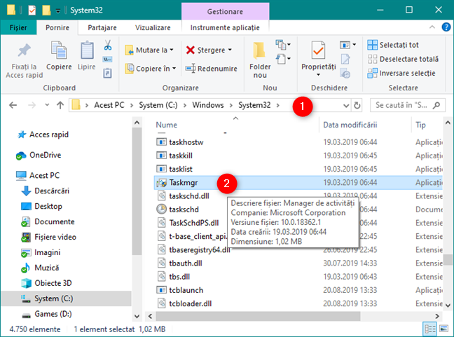Fișierul Taskmgr.exe se găsește în folderul System32 din Windows