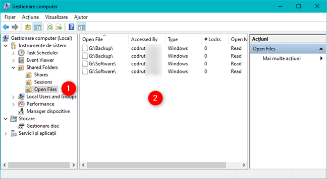 Open Files îți arată lista de fișiere deschise de utilizatorii din rețea